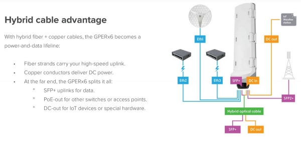 Vďaka DC svorkovnici a SFP+ portom je možné použiť hybridný optický kábel, ktorý v jednom plášti kombinuje optické vlákna na dátový prenos a medené vodiče na napájanie. Hlavnou výhodou je, že na pripojenie zariadenia stačí len jeden kábel.