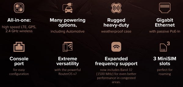 MikroTik LtAP LTE7 kit je robustný 4G LTE Wi-Fi 4 AP, dodávaný s modemom R11e-LTE7 a vstavaným GPS modulom, perfektný pre vozidlá. Zariadenie je vybavené (1) 1Gbit PoE-In portom, (3) mini SIM sloty a (1) SMA female konektorom pre GPS anténu.